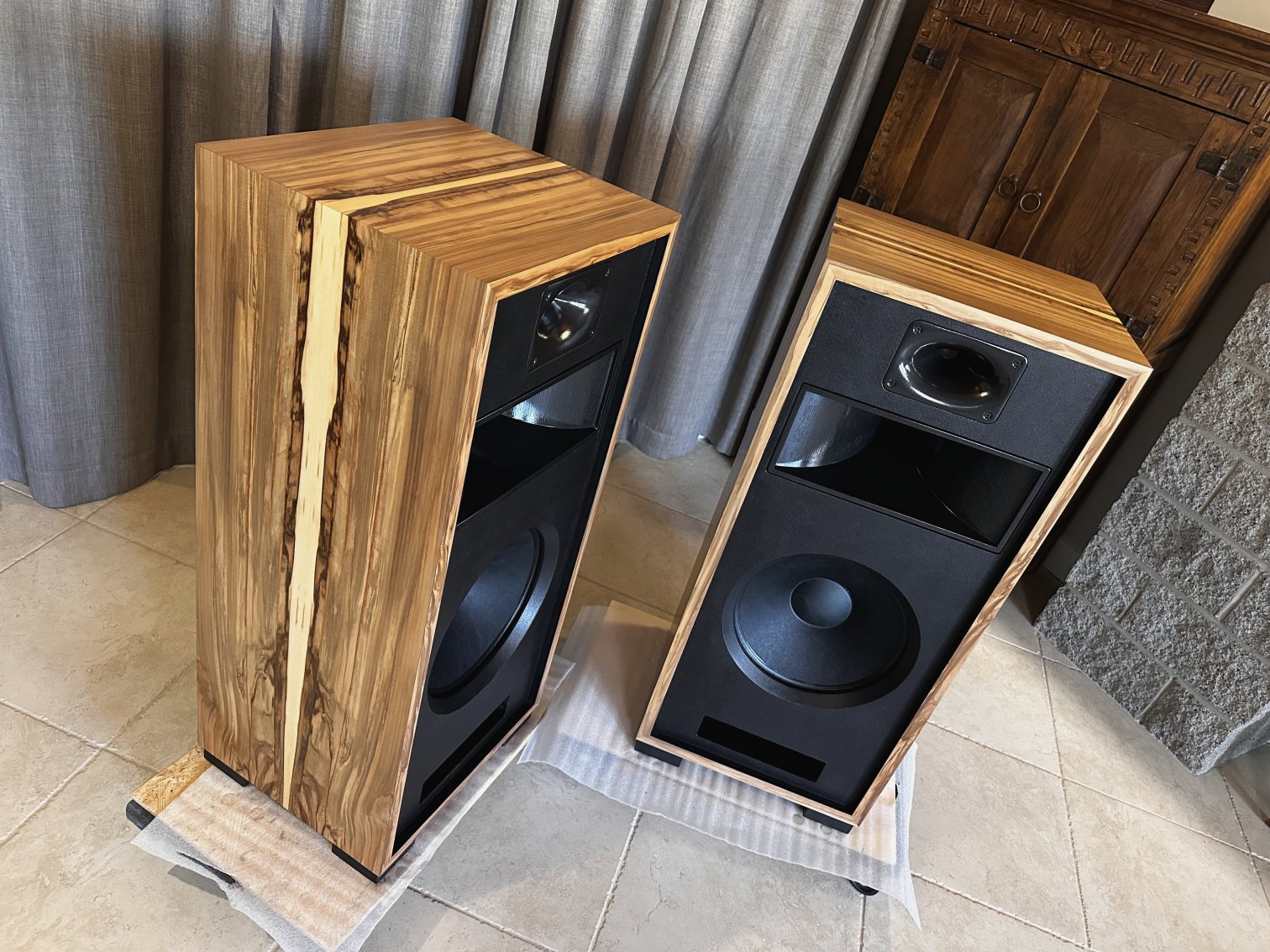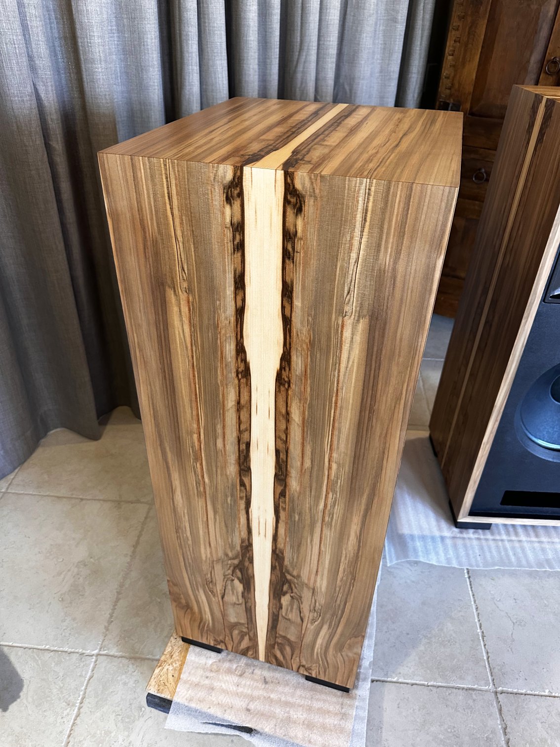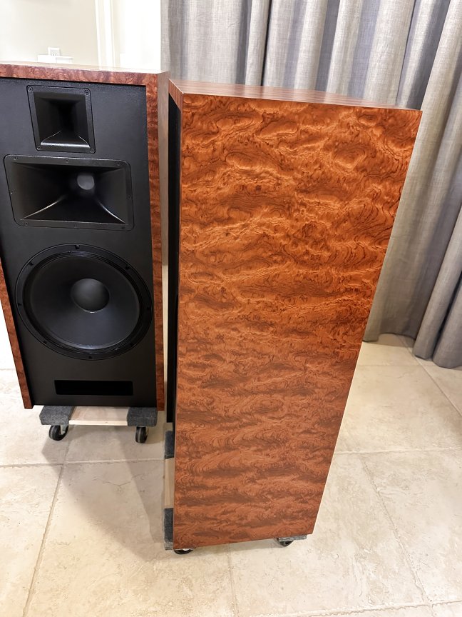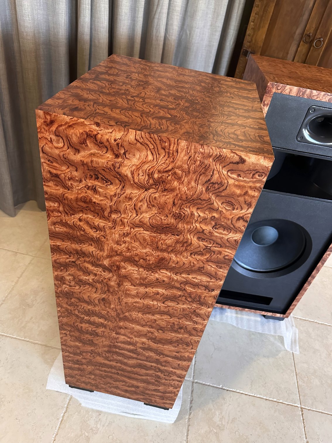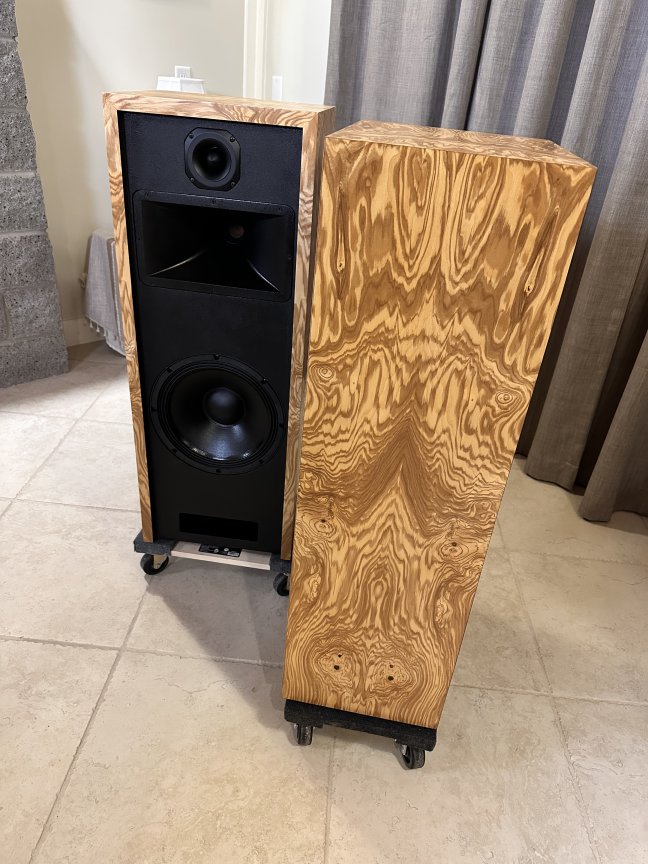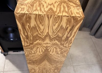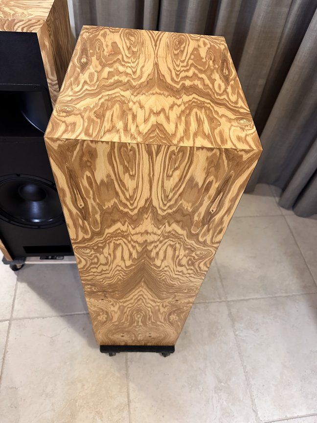 A unique layout of the Olive Ash Burl veneer makes these two-of-a-kind Volti Audio speakers. Check out the pictures. The sides and top have a four-piece veneer layout. Stunningly beautiful in person.