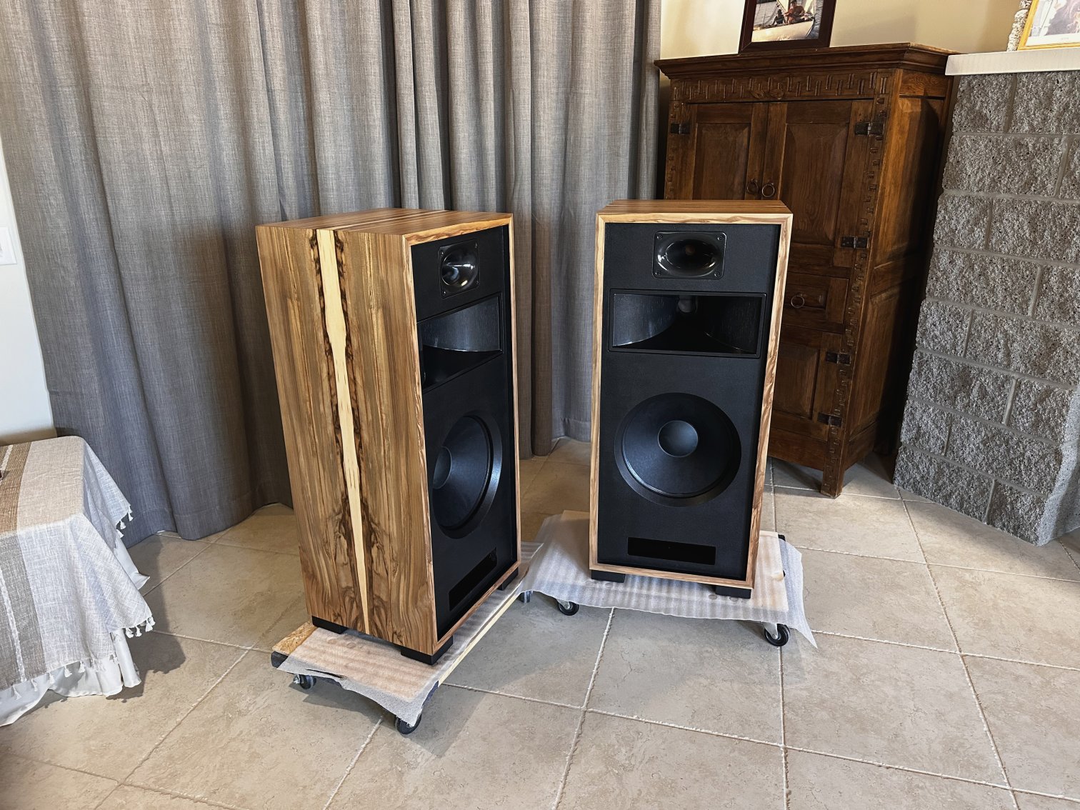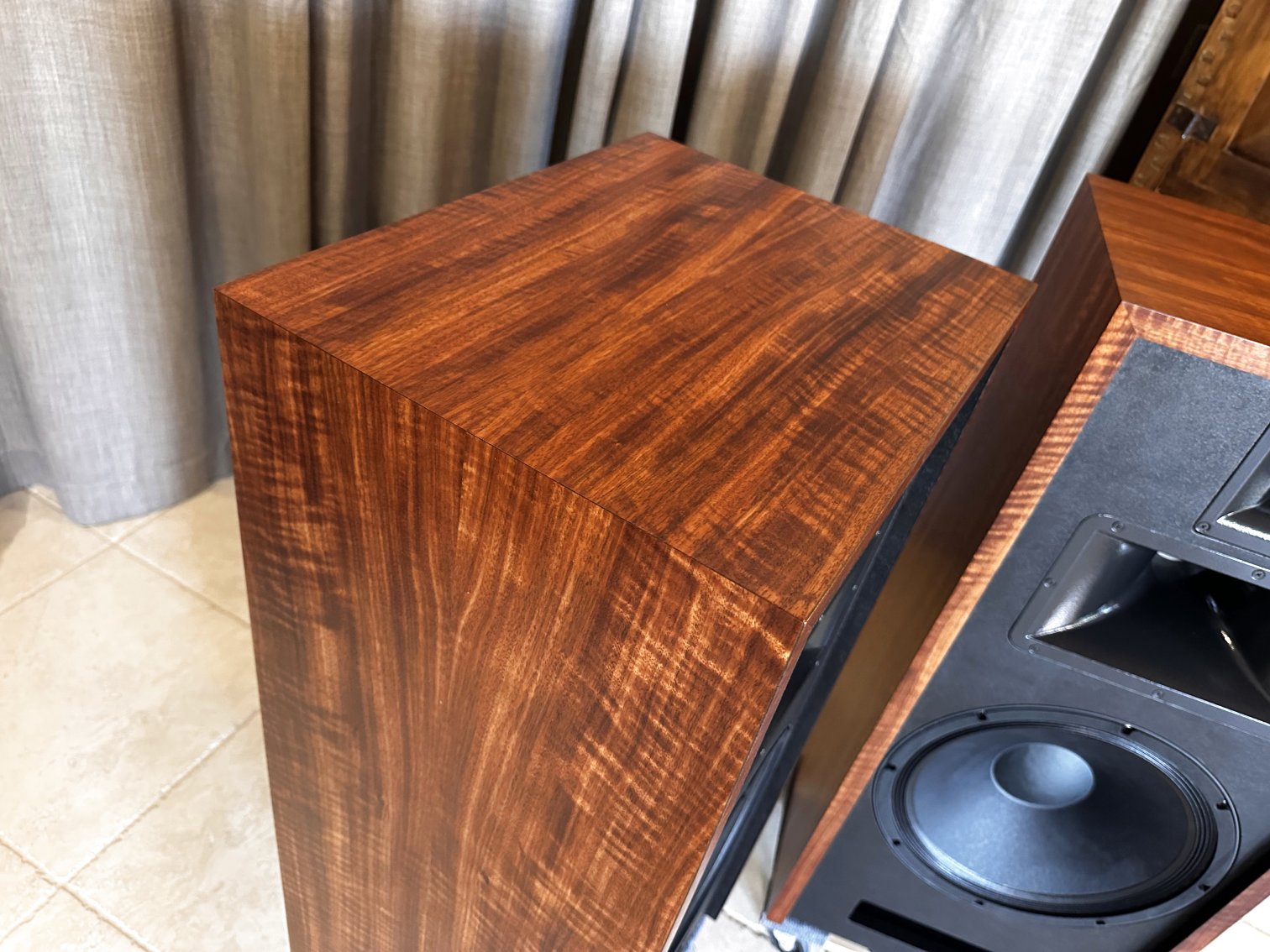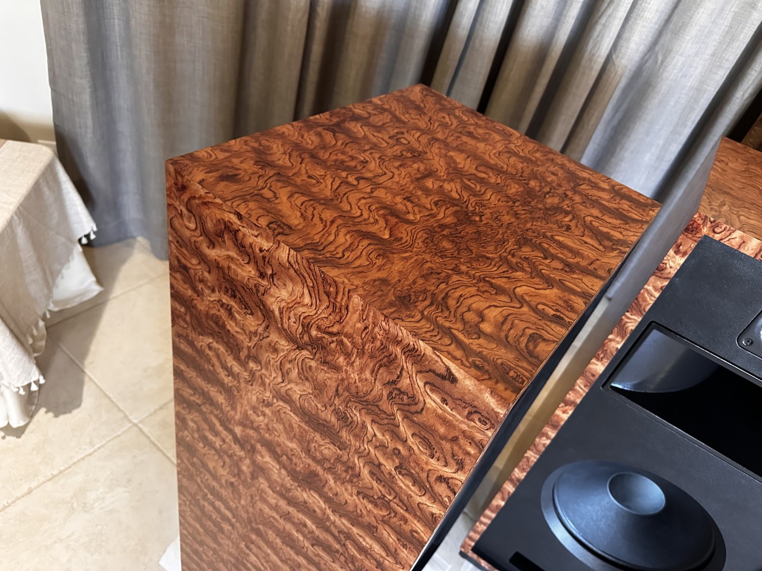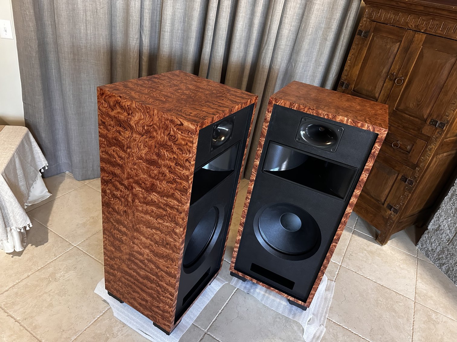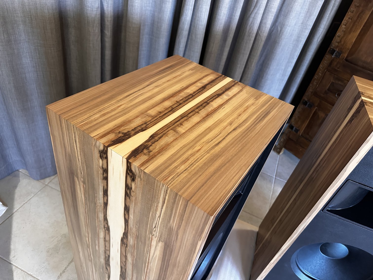 A unique layout of the Olive Ash Burl veneer makes these two-of-a-kind Volti Audio speakers. Check out the pictures. The sides and top have a four-piece veneer layout. Stunningly beautiful in person.