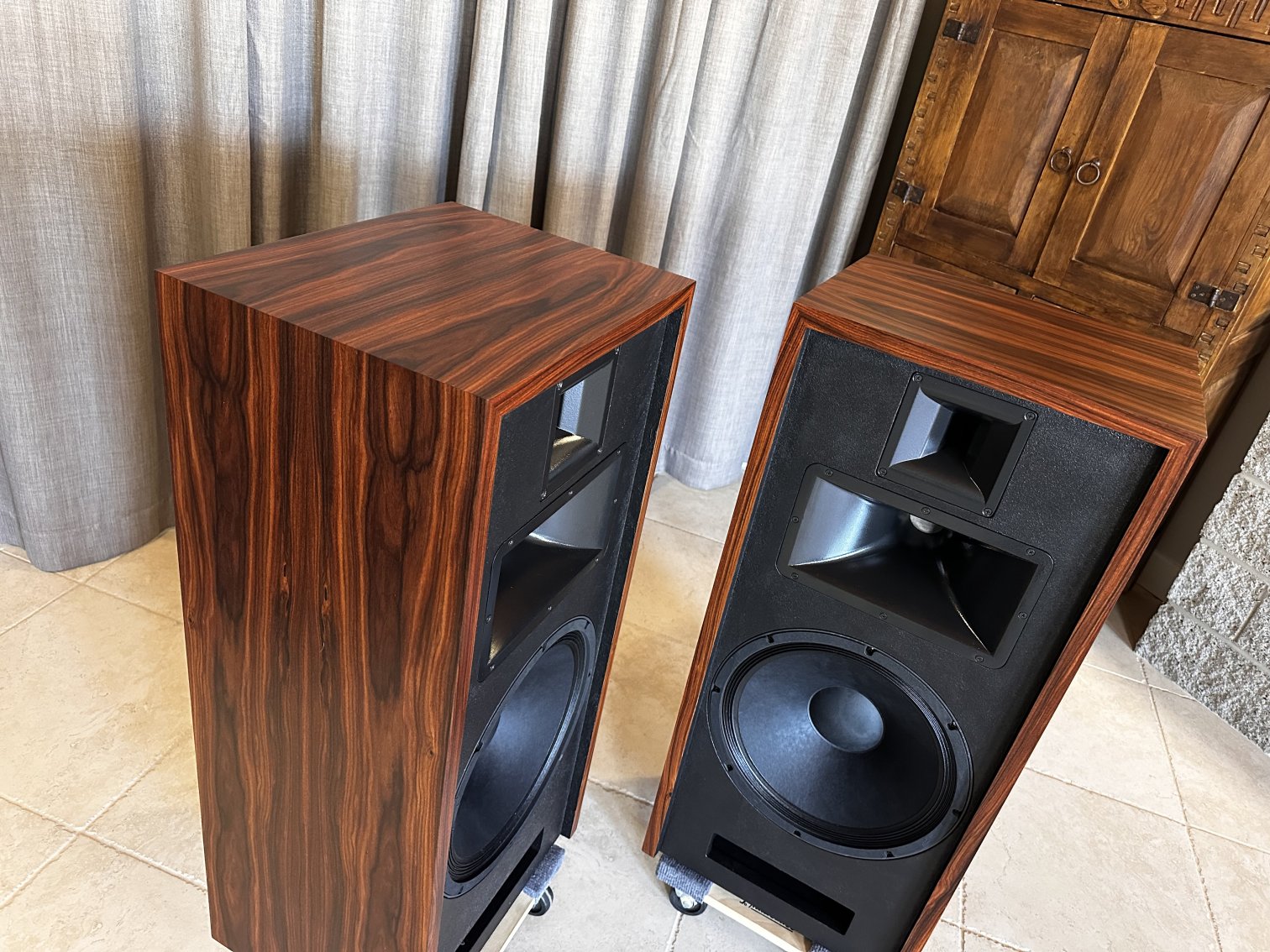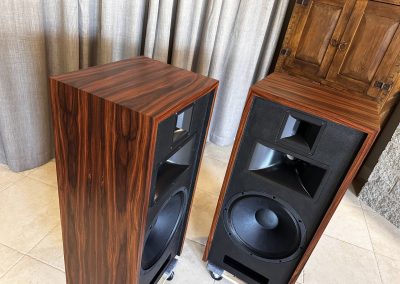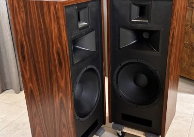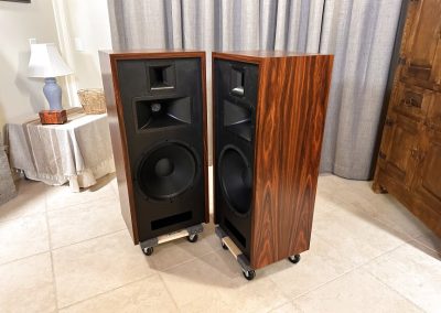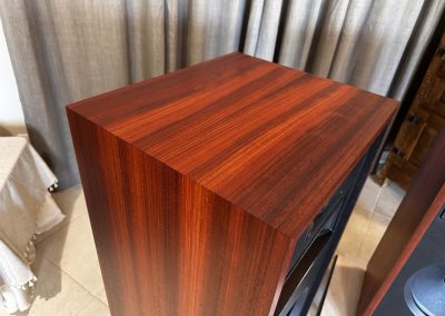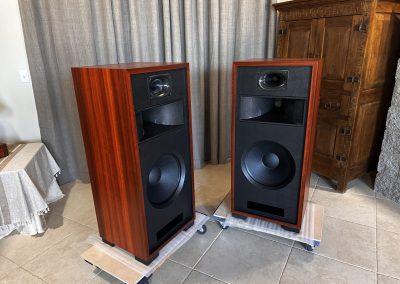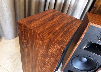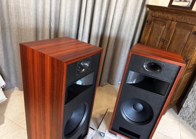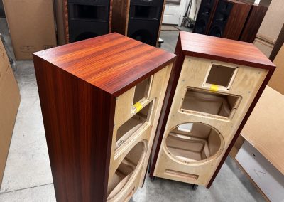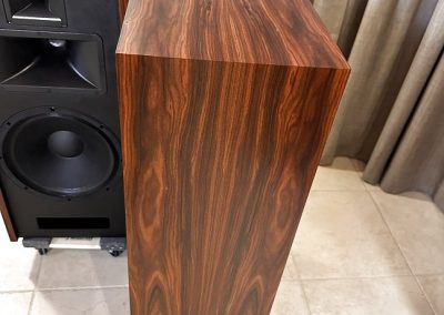Type I Rivals with full veneer (backs are painted). Notice on the Type I Rivals how the drivers are mounted on the backside of the front motorboards for a very clean, finished look to the rosewood fronts. A rare pair of Volti Audio speakers, and with one of the most beautiful Rosewood veneers I’ve seen in a long time.