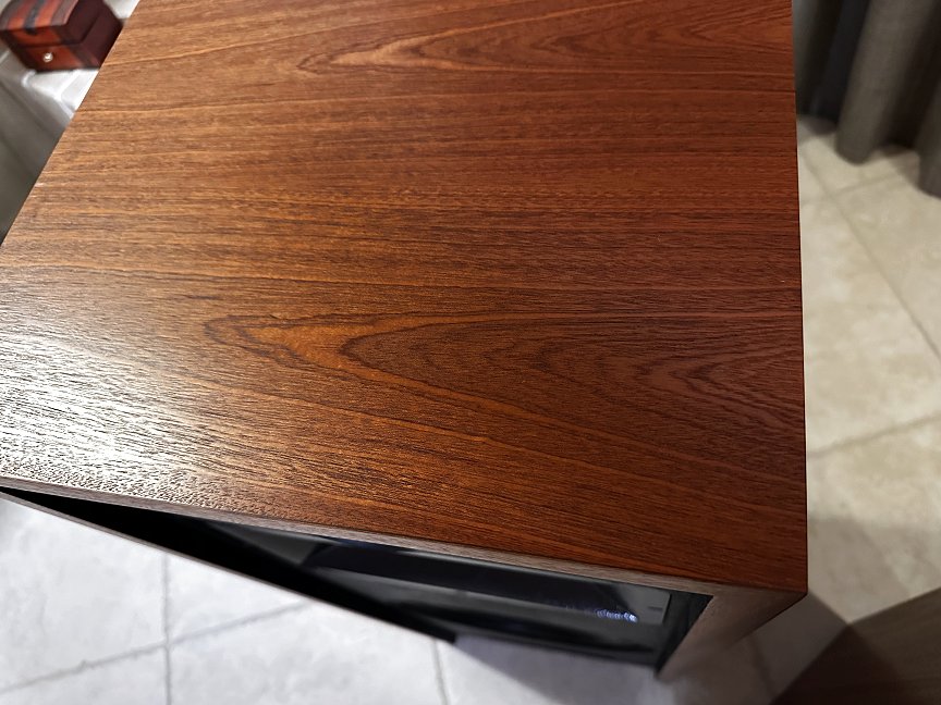Padauk is from a tree in Africa. That’s the actual color with clear finish over the wood – no stains involved here. Notice how this is one panel across the width of the speaker with no seams. I’m not suggesting this is a good or a bad thing, just that it is. This veneer has a real nice texture and you’ll find a few natural imperfections in the wood, which means there’s no mistaking that this is a real wood veneer on your speakers. The clear lacquer finish enhances all of the great color and texture this veneer has to offer. Will darken a bit over time.