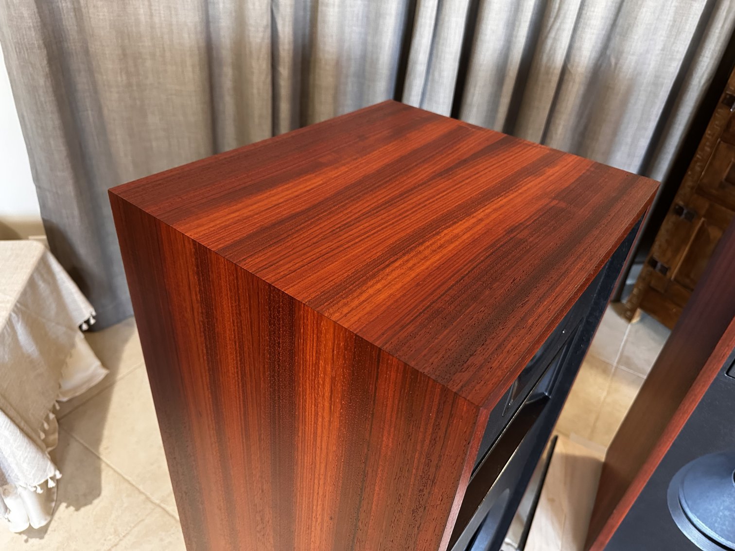 Padauk is from a tree in Africa. That’s the actual color with clear finish over the wood – no stains involved here. Notice how this is one panel across the width of the speaker with no seams. I’m not suggesting this is a good or a bad thing, just that it is. This veneer has a real nice texture and you’ll find a few natural imperfections in the wood, which means there’s no mistaking that this is a real wood veneer on your speakers. The clear lacquer finish enhances all of the great color and texture this veneer has to offer. Will darken a bit over time. A unique pair of Rivals.
