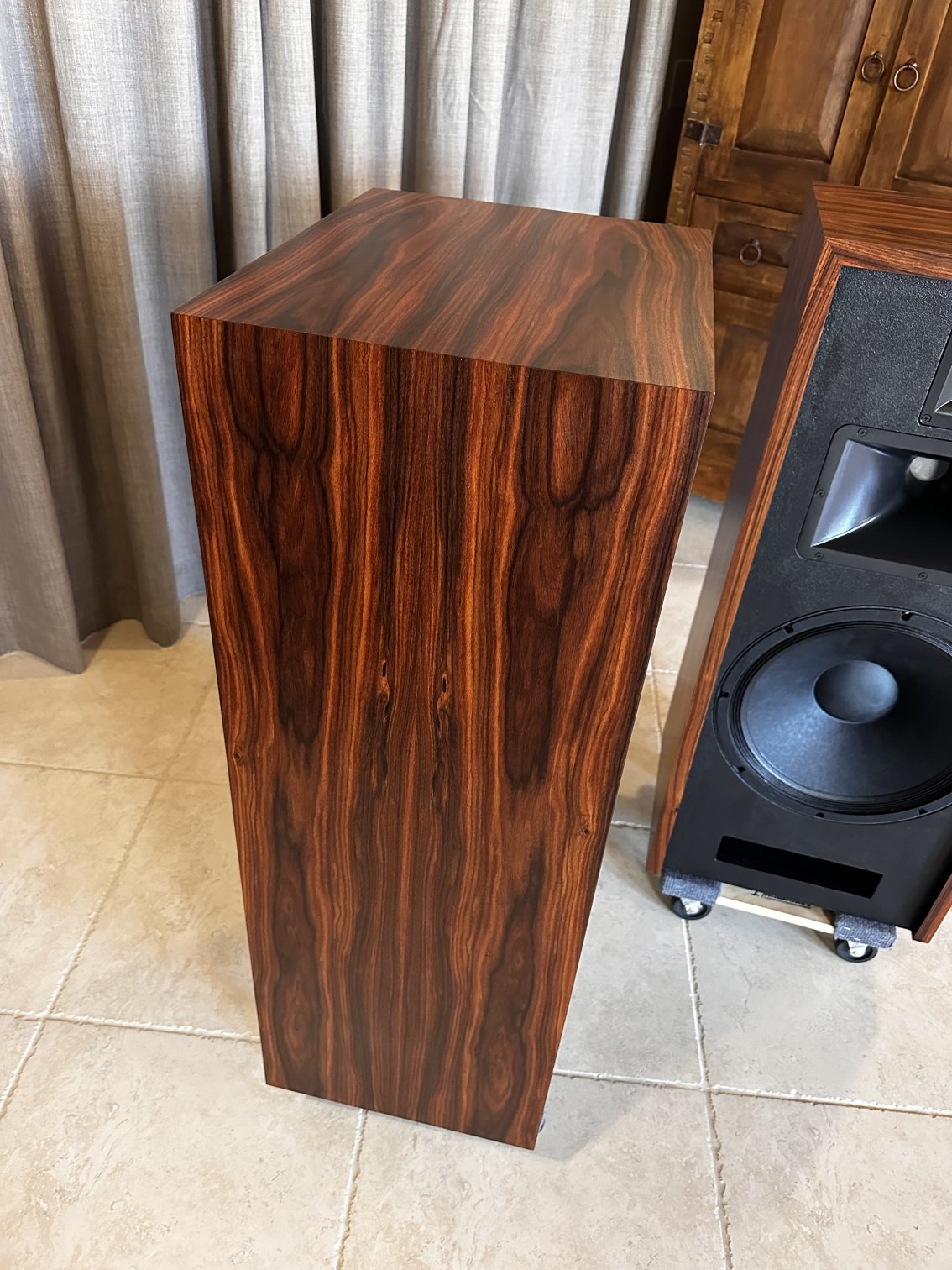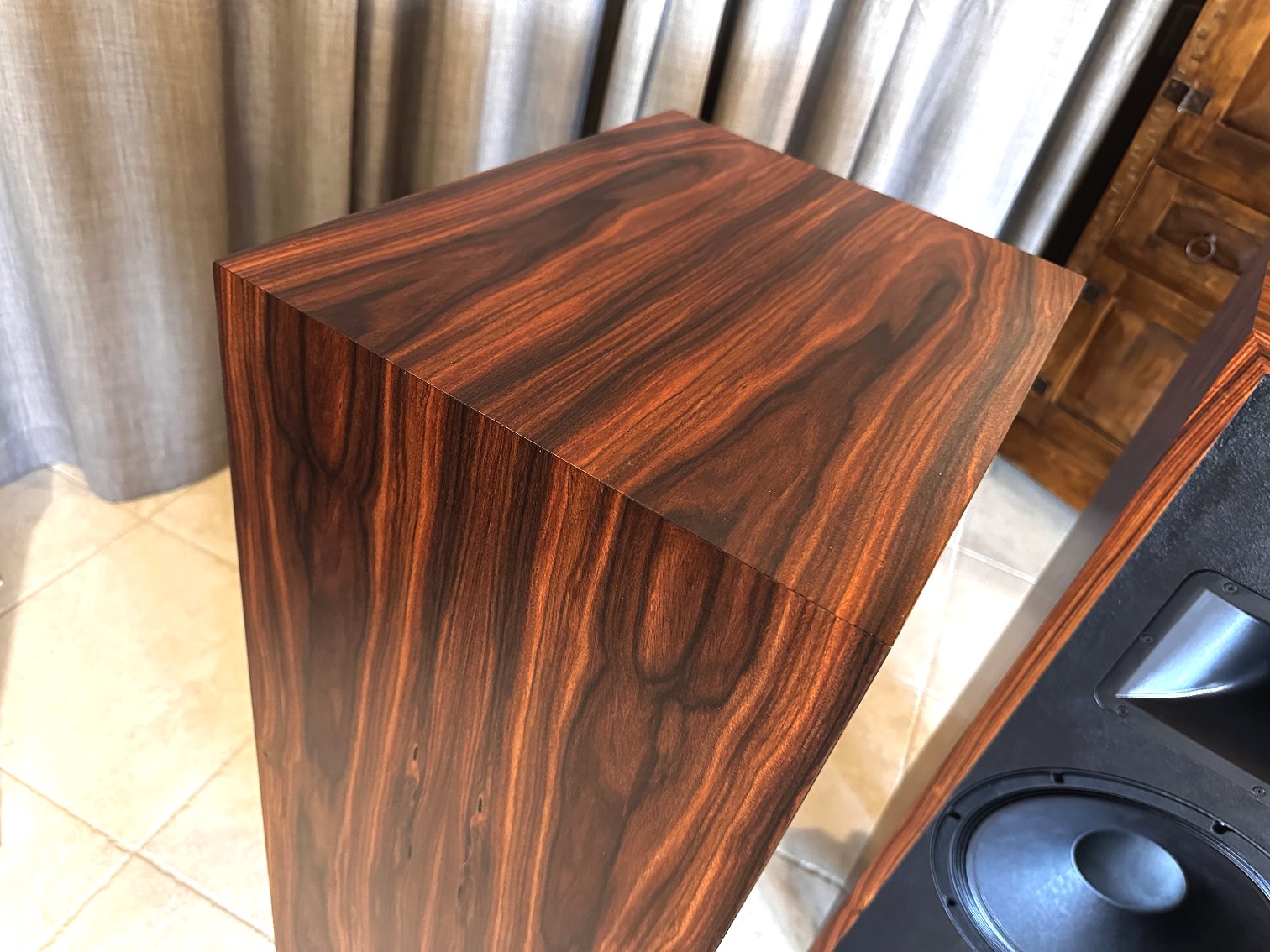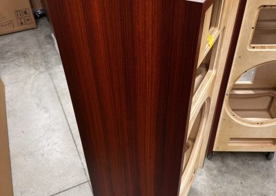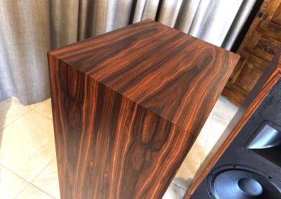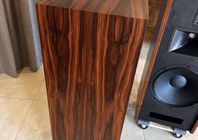 Here’s a pair of demo Razz in a very unique rosewood veneer. Notice how the veneer layout is wrapped around the speaker cabinet and mirrored from left to right speaker. Who does that?!